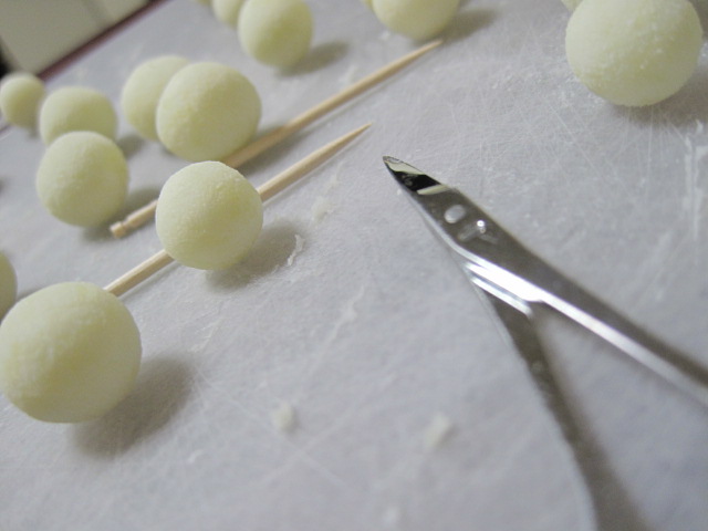 シロツメクサの石鹸の基。 まぁるくまぁるく丸めていきます。 まんまるになった切れ端石鹸達。 これを爪楊枝に刺して シロツメクサを作っていきます。 ここからは、もうひたすらに地味な作業です。 こんなのでシロツメクサが出来るのか、 謎かもしれませんが・・・。(笑) 今暫くお付き合いを♪