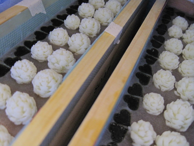 保温中なので、温度が下がらないように ささっと写真を。 蓋を半開きでの写真ですので、 もややんとしておりますが。(笑) 断面図がとても楽しみです♪ 良い感じにけん化しておりますよ。 しかし。 ゆっくりとけん化反応して 良い子に育ってね、と思う反面。 早く断面図が見たい!と思ってしまうのは 人間の我儘さ故でしょうねぇ。(笑) あまりデコレーションをしないので、 久々にわくわくする石鹸さんです♪