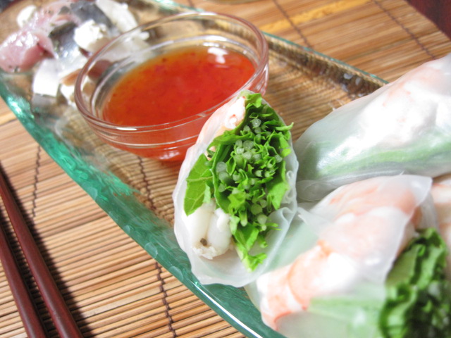 水菜とエビの生春巻きをスイートチリソースで。