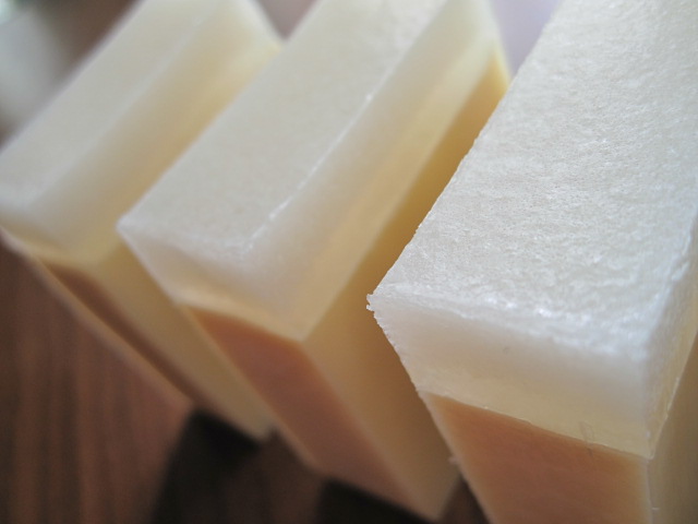 先日仕込んだ、 ジンジャーinfとシアバターを入れた石鹸さん。 上の層は昨日作ったココナッツバーと同じもの。 陽に翳すときらきらして綺麗です♪ 保湿系も良いのですが、 寝かせておきたい夏用もそろそろ 仕込んでおきたいなぁ、と。 昨日、素材の引き出しから 薄荷脳を出しました。 でもその前に、春用の石鹸ですよね。(笑) 可愛らしいコを作ってあげたいと思います♪